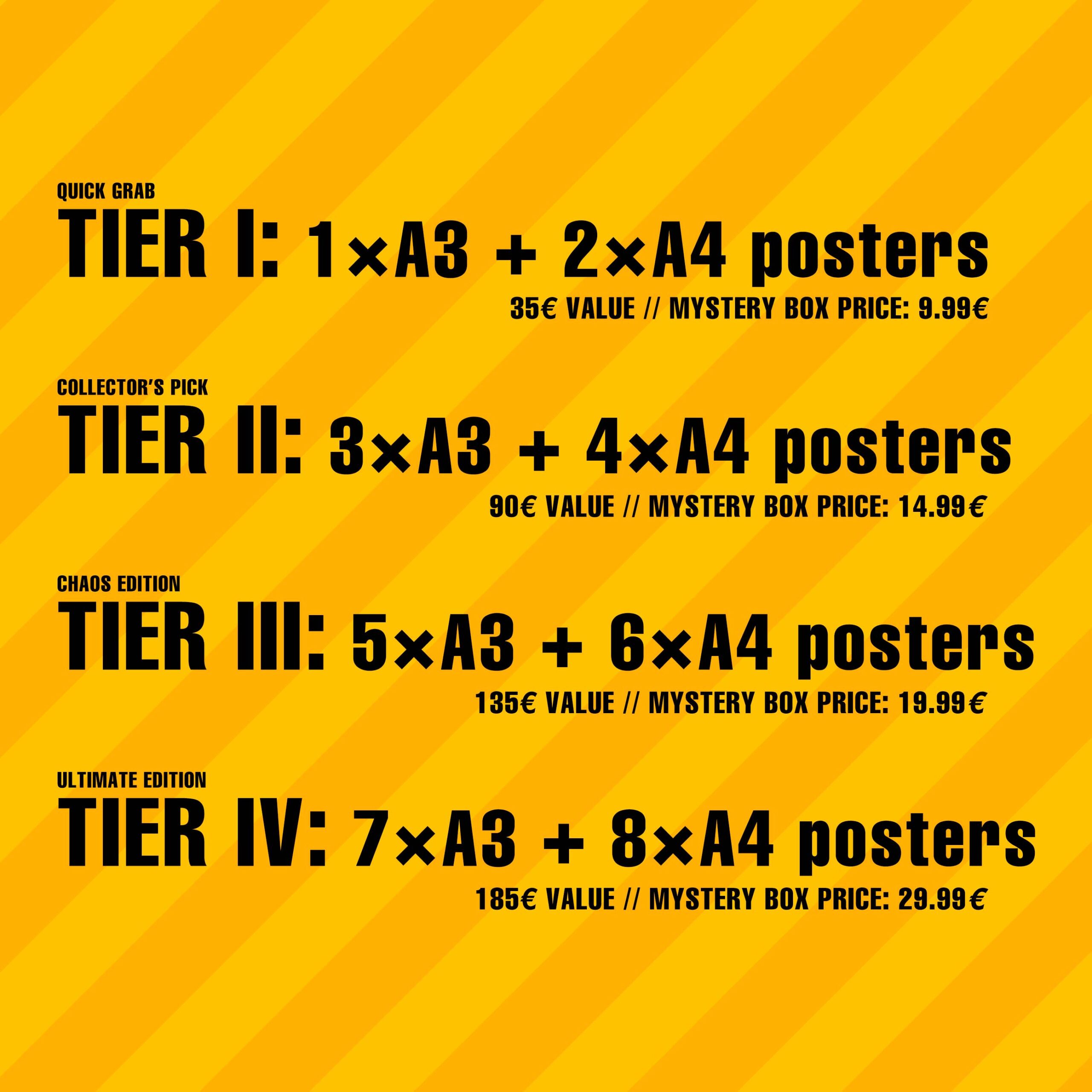 • Tier II — Collector’s Pick: 3×A3 + 4×A4 posters // 90€ VALUE // Mystery Box Price: 14.99€