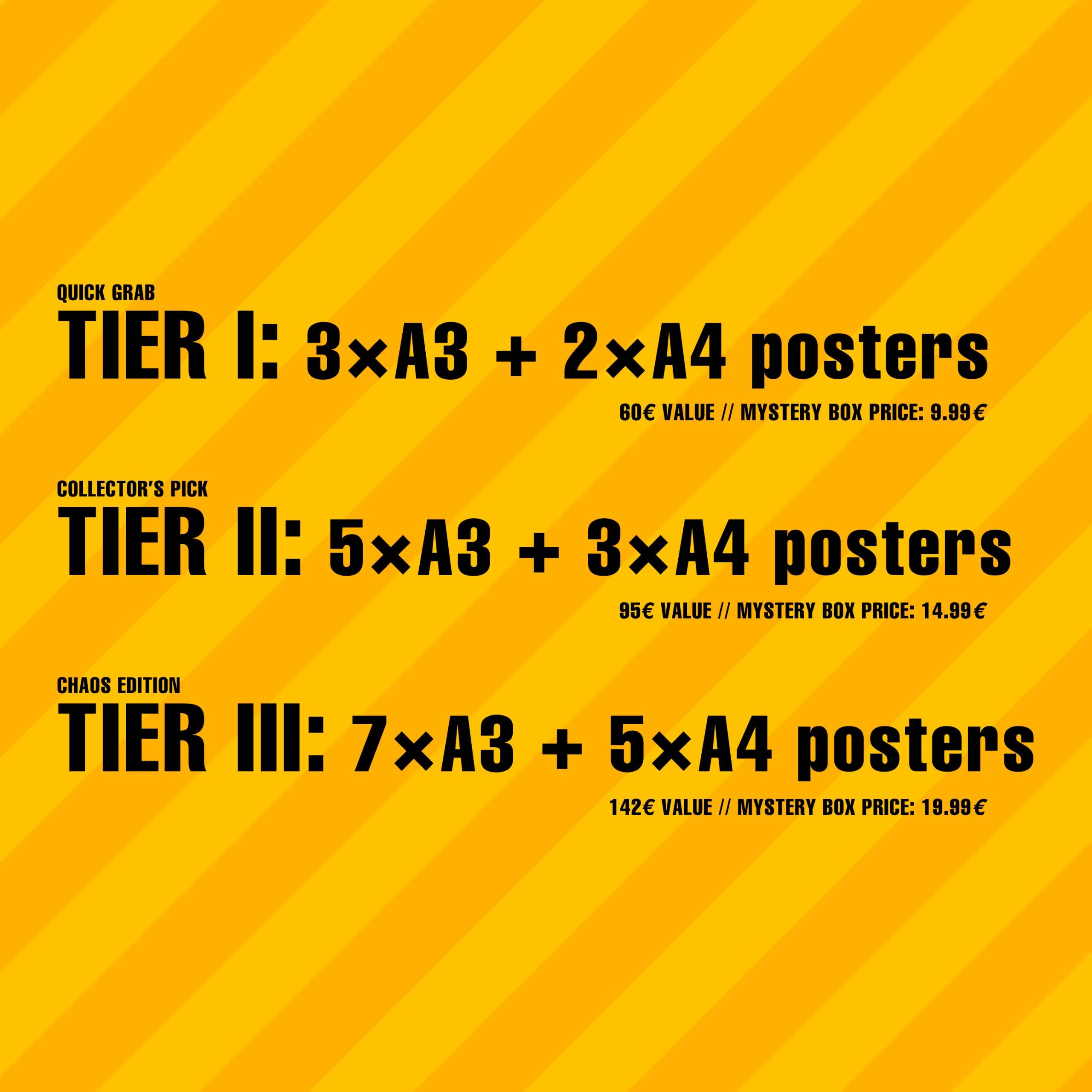 • Tier I — Quick Grab: 3×A3 + 2×A4 posters // 60€ VALUE // Mystery Box Price: 9.99€